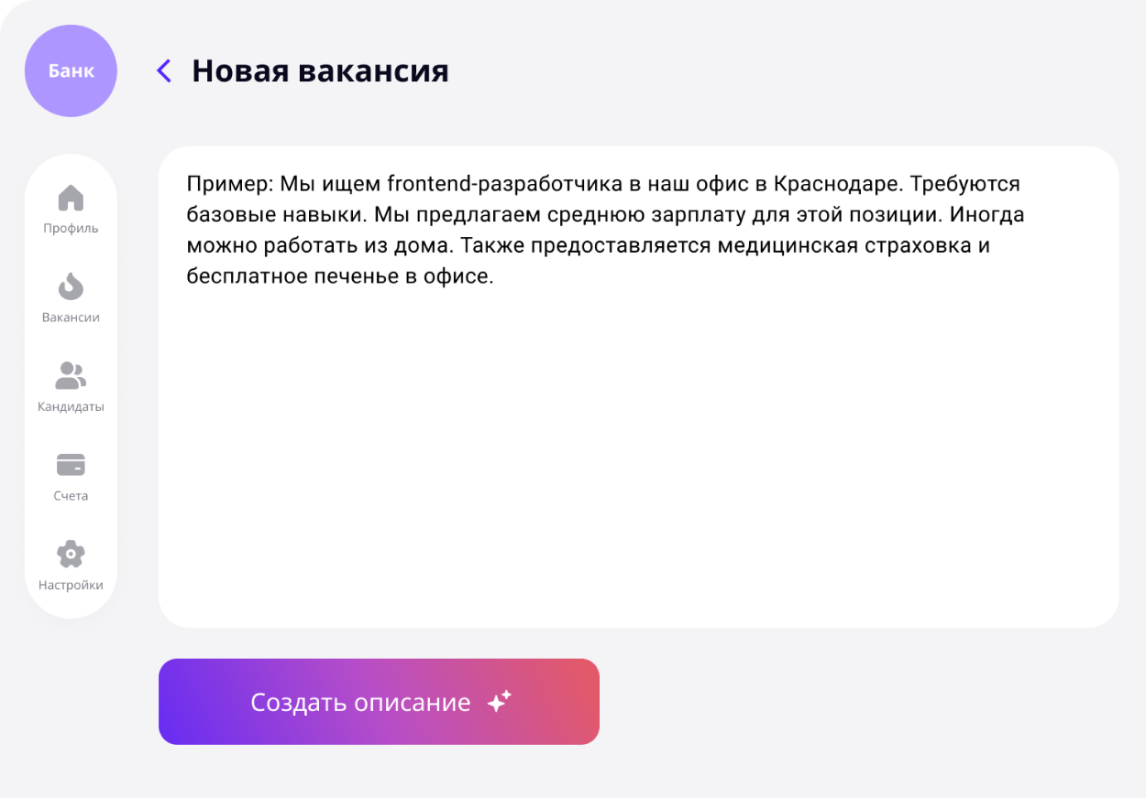 Вы предоставляете описание вакансии в свободной форме, выделяя наиболее важные аспекты. Платформа самостоятельно сформирует полное описание позиции, учитывая ваш запрос и уточняя дополнительные параметры, которые могут повлиять на выбор кандидата.