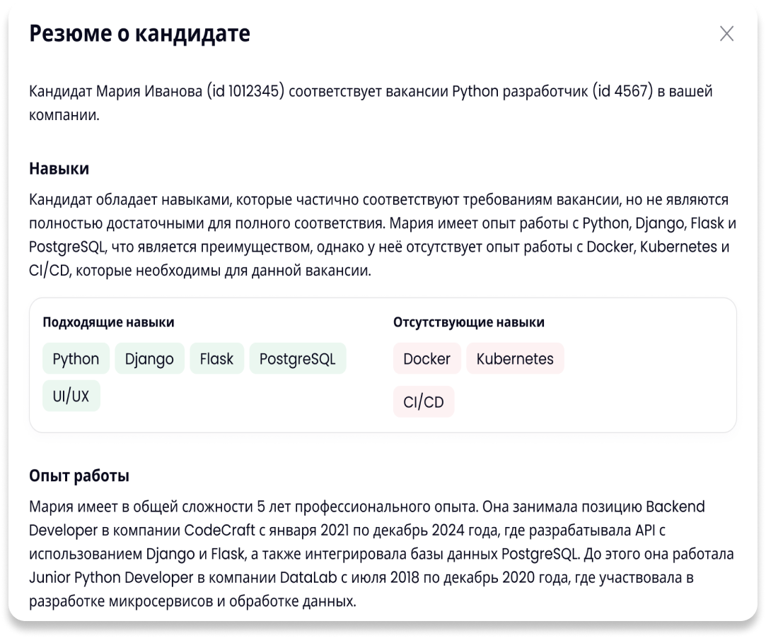 Использование ИИ для анализа данных помогает определить, насколько кандидат соответствует требованиям. Навыки и опыт каждого кандидата можно обсудить с ИИ.